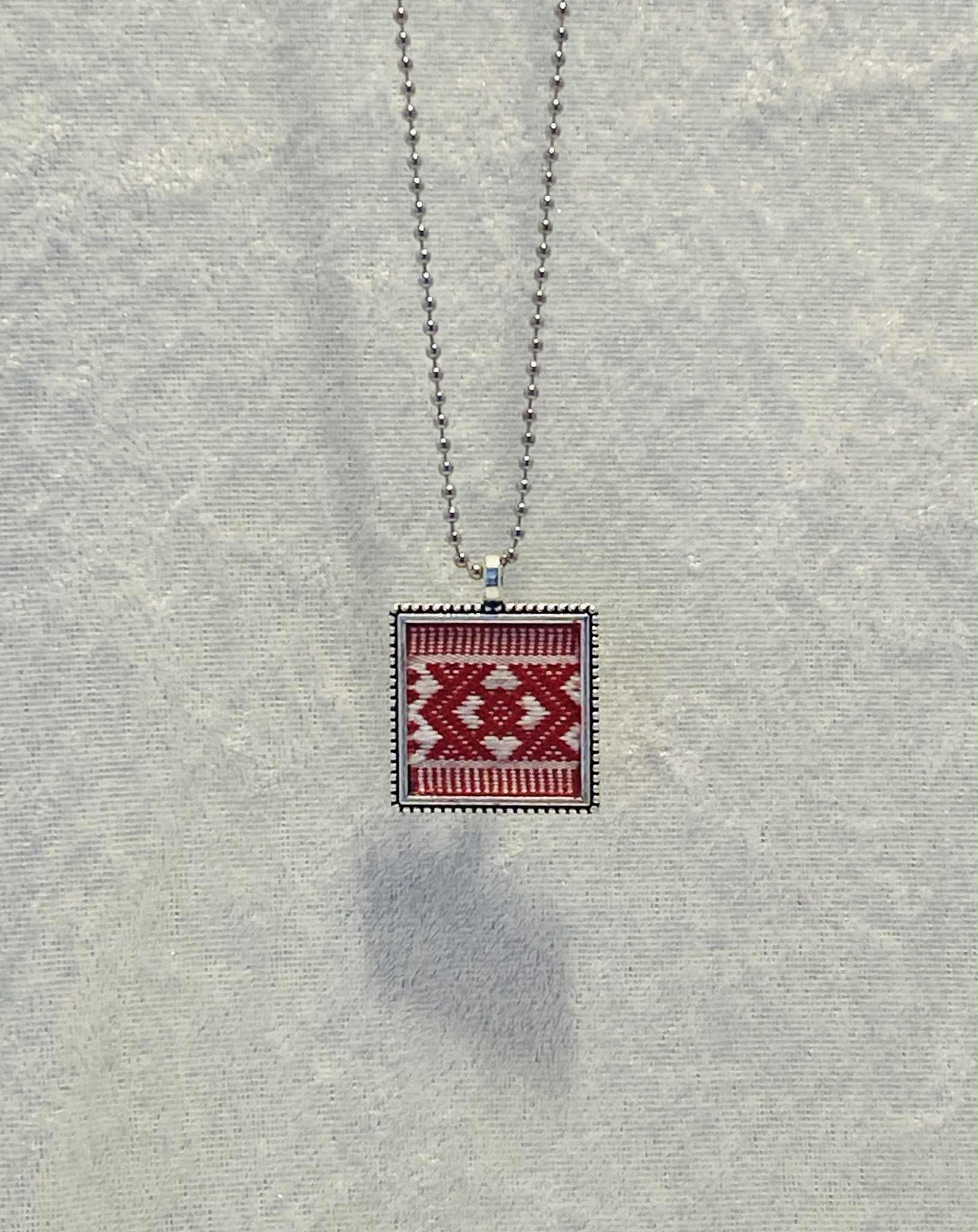 Vackert halssmycke med vävt dalaband i kvadratiskt hänge, röd.